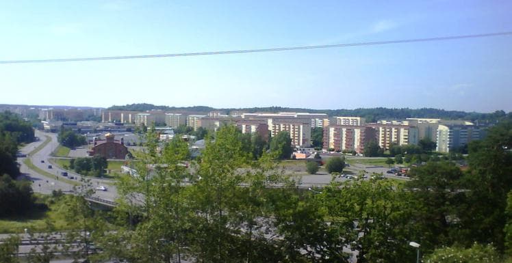 Hallunda med E4:an i förgrunden, sett från Albyberget.