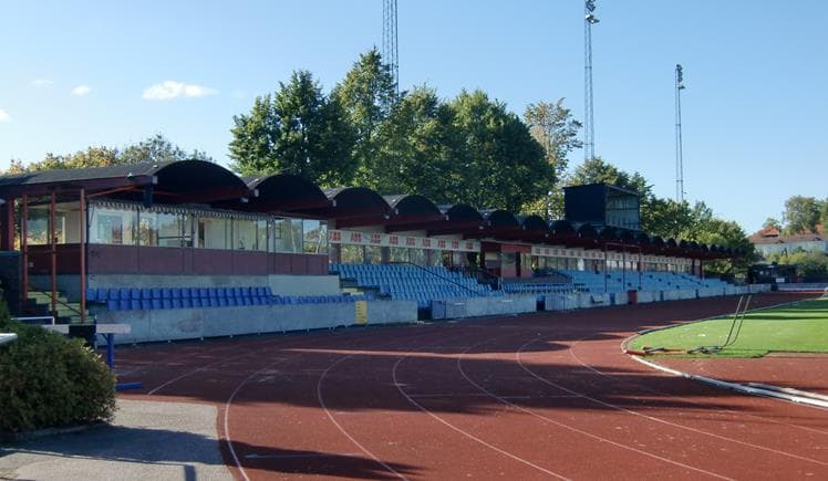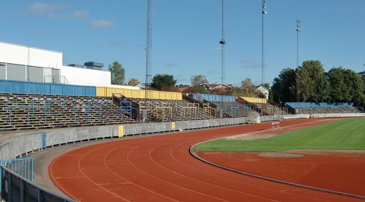 Sittplatsläktaren, med sina karaktäristiska valvbågar av plåt.