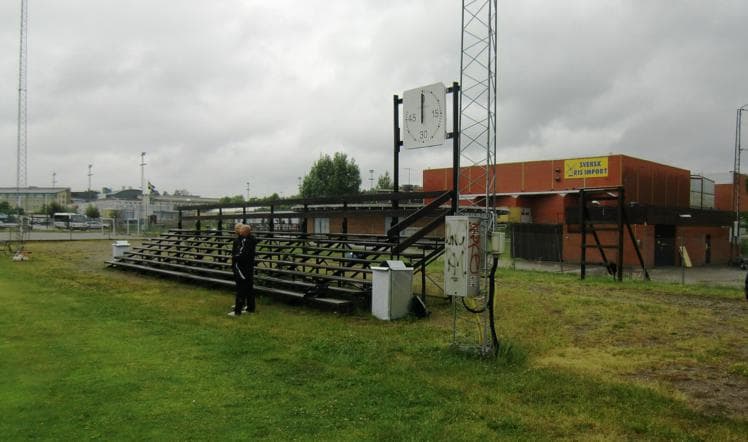 En minimal läktare, ett rostigt elskåp, och ”Svensk risimports” lokaler i bakgrunden.