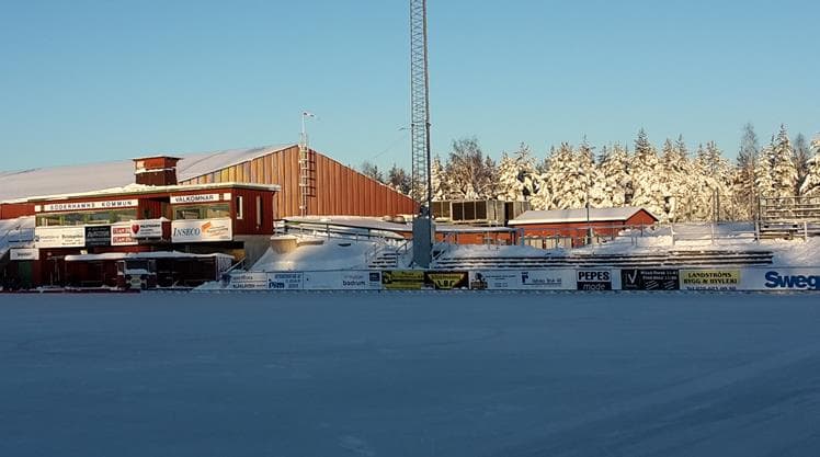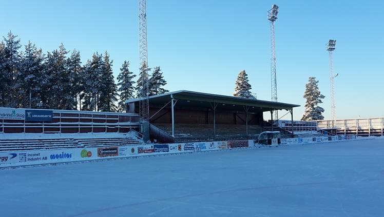 Huvudläktaren på Hällåsen flankerad av ståplatsläktare.