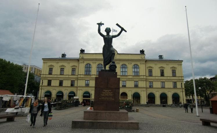 Fredsmonumentet på Stora Torget – ibland kallat ”Kärringa med klappträt” – med Rådhuset i bakgrunden.