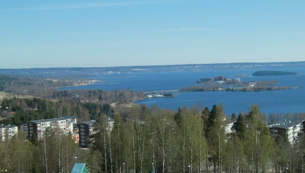 Vårsolig utsikt över Klingerfjärden från Timrå centrum.