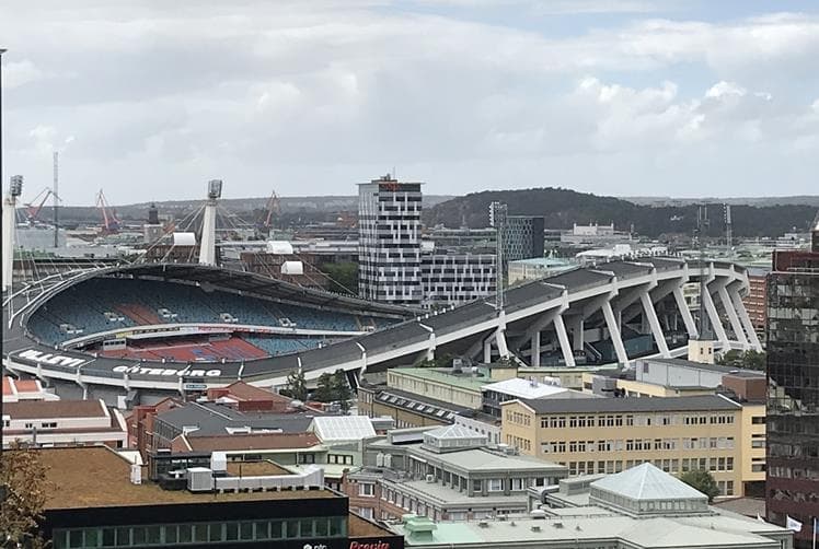 Den mäktiga (Nya) Ullevi sett uppifrån ”Snikens kulle” på andra sidan motorvägen, varifrån man kan tjuvlyssna på (Nya) Ullevi-konserter.Stämning/klack