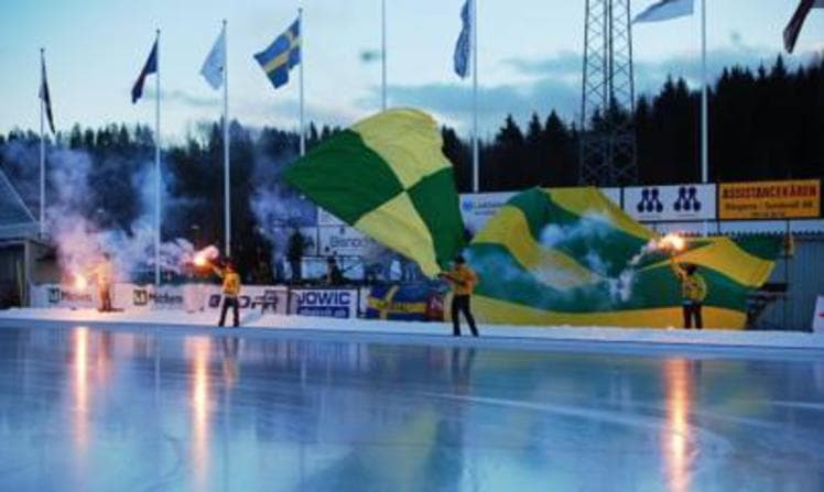 Gulgröna Ljusdal poserar i mörkret på sin vackra hemmaarena.