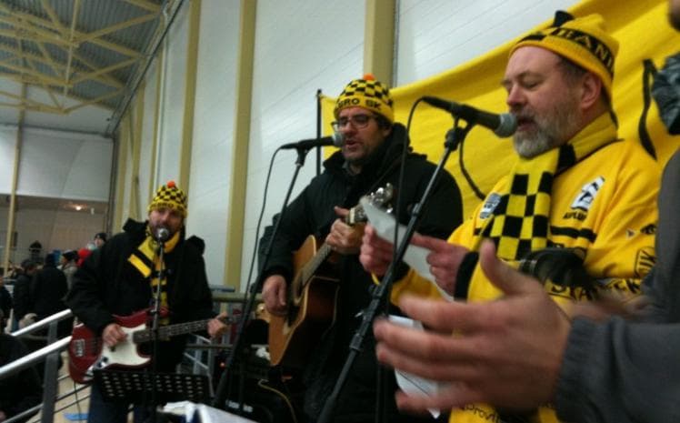 Sång och musik på bandyläktaren. Mr. Svampen själv, ”Svampen-Robban”, till höger i bild.