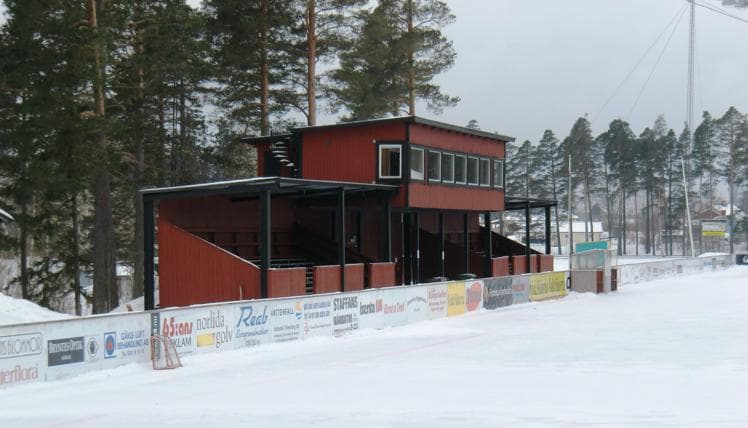 En faluröd stuga i skogen – fast knutarna är svarta. Läktaren på Skutskärs IP har hög mysfaktor.
