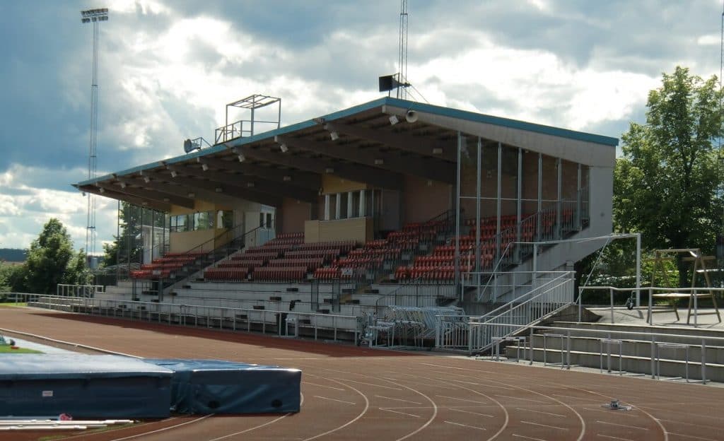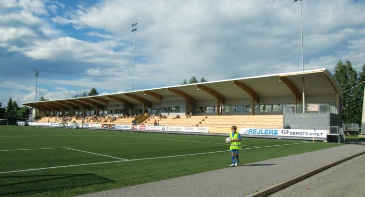 Huvudläktaren på Norrvallas konstgräsplan i modernt limträ.