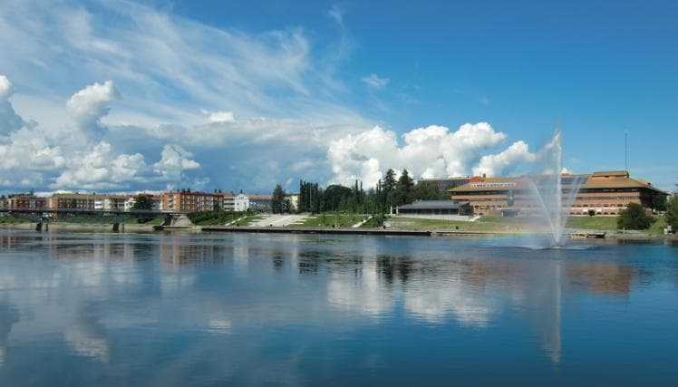 Skellefteås brunmurriga kommunhus sett från andra sidan älven.