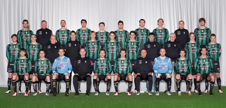 Makrillarna från Götet? Nej, men Varbergs BoIS har också valt grön-svartrandigt. Här i 2012 års upplaga, bl.a. innehållande den blivande Siriusspelaren Jonatan Berg.