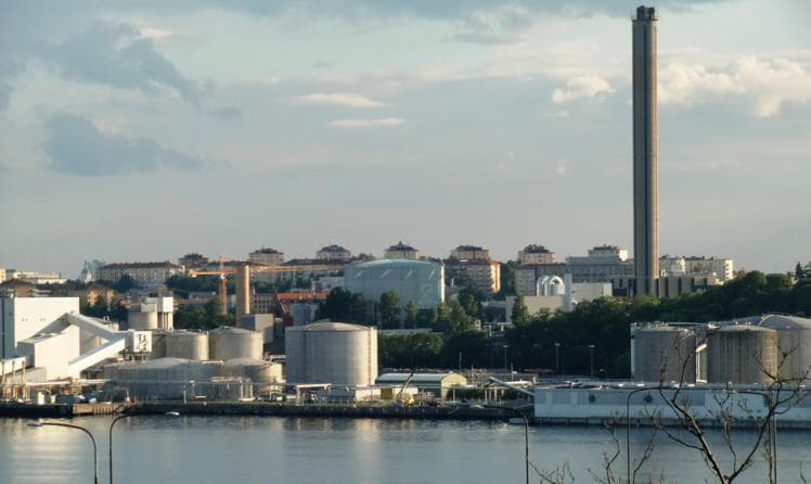 Värtahamnen med värmeverkets väldiga skorsten i bakgrunden.