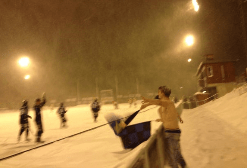 Efter inbetalad entrépeng och intagen, oskottad bortasektion med dittejpad Östra Aros-banderoll fick vi åtminstone bevittna två hela 3×30-perioder. Inte alla av oss dock. Nio minuter in i den här perioden, vid oförändrad ställning, avstannade spelet för diskussion om fortsatt spel. Och fortsatt spel och tittande (hejande) blev det, men inte för alla av oss. En av våra som vid konferensen höll i ett värmande pyrotekniskt föremål fick prata med Söderhamns konstapel och i samråd med denne lämna arenan och sätta sig i minibussen. Efter ett tag hör vi dock Sirius-relaterade skrik komma från något skogsparti och det visar sig vara vår utslängde kamrat, som där någonstans hittat ett titthål att följa matchen från och denne kämpe lyckas även där göra sig hörd. Han vittnar om blå-svart dominans på läktaren, trots att vi bara var ett drygt handfulla där, dessutom utan tak som akustiskt stöd eller för den delen skydd från den sjuka snöstormen som rådde.