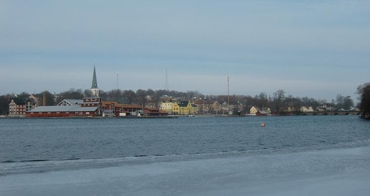 Här ryms alla Motalas sevärdheter i en enda vy. Från vänster till höger: Motormuséet, kyrkan, radiomasterna och Strömbron.